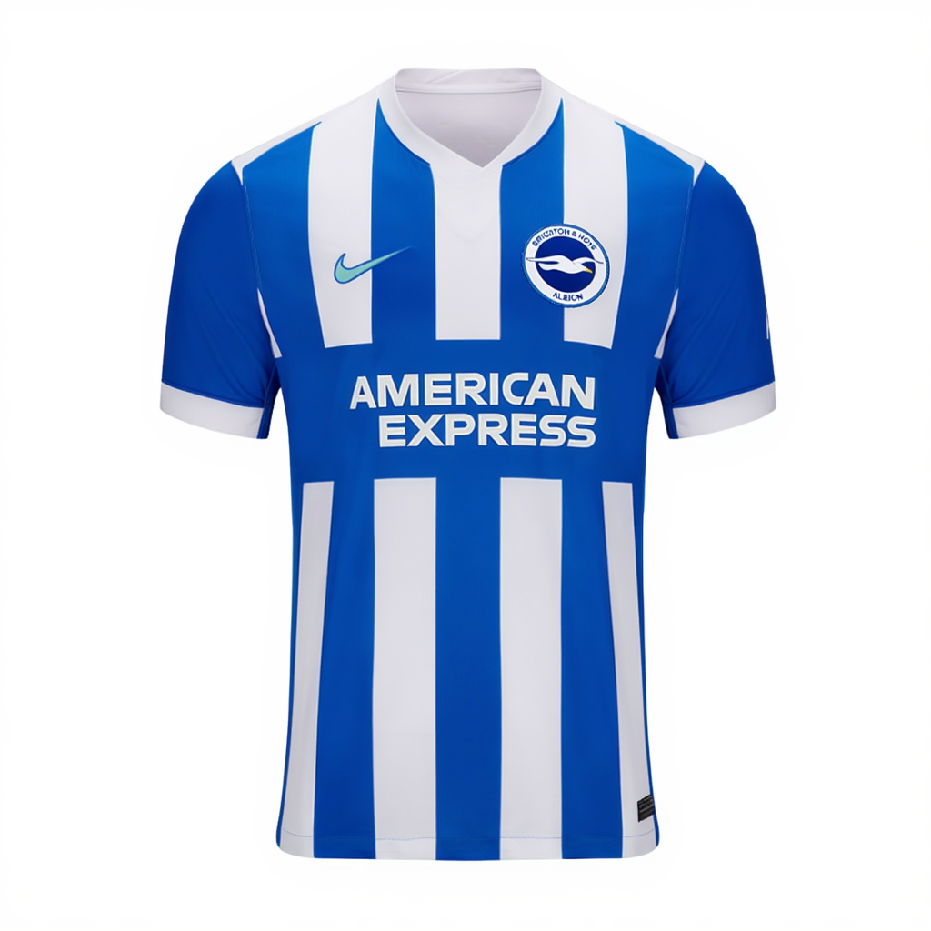 The timeless blue and white stripes with a bold central panel deliver a clean, recognizable look that represents Brighton’s football heritage.